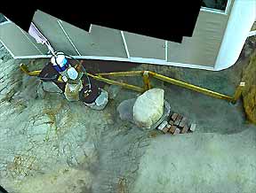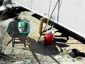 | Deck & cradle: |  Rock steps at trailer door | Future deck area washed to bedrock |  Mo. Trailer undercarriage on blocks |